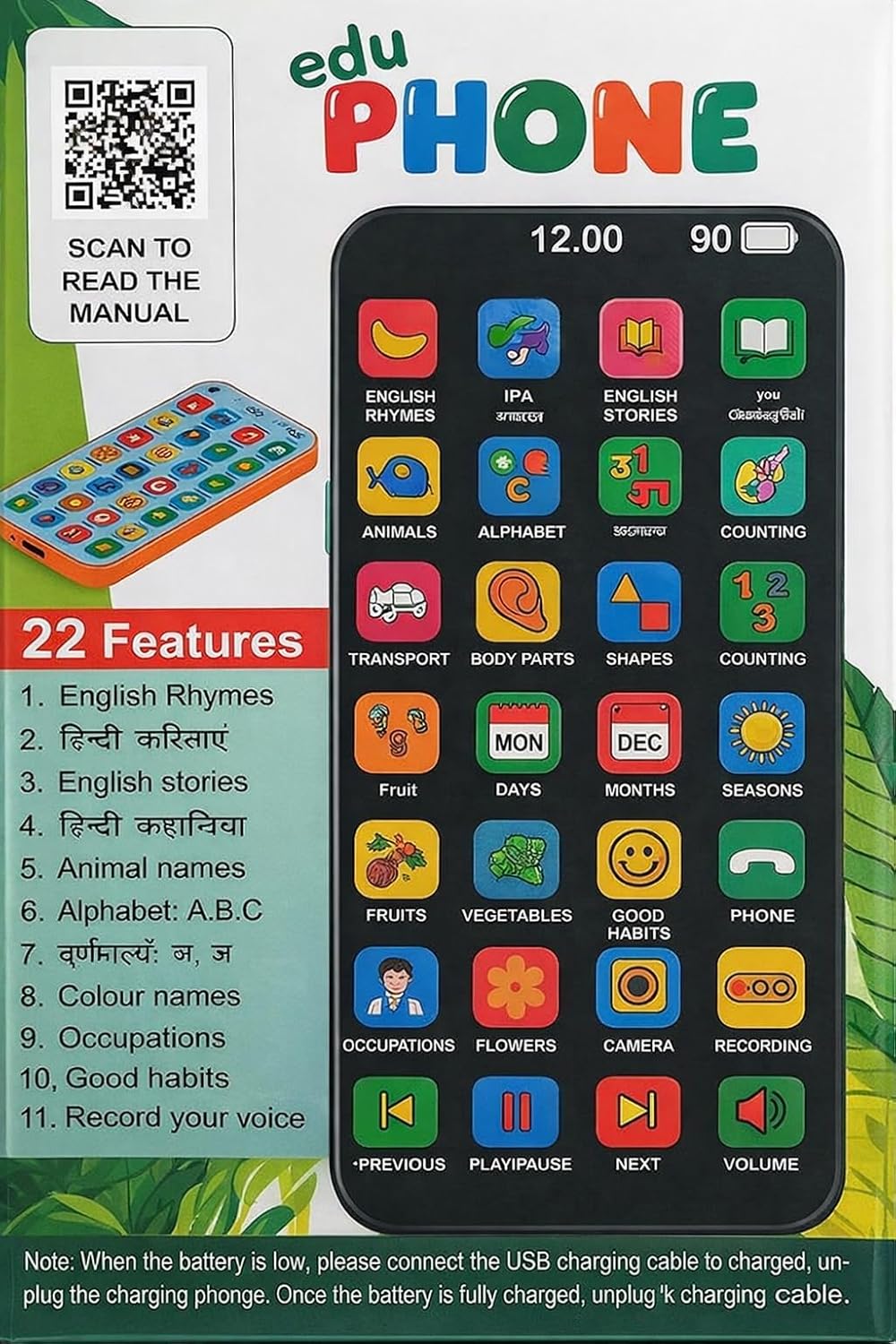 Details The Edu Learning Phone for Kids is a fun, interactive, and screen-free educational toy specially designed to support early childhood learning. With 28 engaging learning functions, this toy phone introduces kids to alphabets, numbers, colors, animals, fruits, vehicles, rhymes, and musical sounds in an enjoyable way. Its colorful buttons and realistic mobile-phone design encourage children to press, play, and learn independently. This educational phone helps improve listening skills, memory, pronunciation, hand-eye coordination, and imagination while keeping kids away from harmful screen time. Made from high-quality, non-toxic plastic, the Edu Learning Phone is safe, durable, and perfectly sized for small hands. It is an ideal learning companion for toddlers and young kids, suitable for both home learning and playtime. A perfect gift choice for birthdays, festivals, and early education needs. Details of 28 engaging function- Alphabet AZ sounds 1. Number learning (110) 2. Color identification 3. Animal sounds 4. Fruit names 5. Vegetable names 6. Vehicle sounds 7. English nursery rhymes 8. Musical tunes 9. Piano music mode 10. Question & answer mode 11. Pronunciation learning 12. Word recognition 13. Memory skill development sounds 14. Logical thinking prompts 15. Shape recognition 16. Nature sounds 17. Interactive play mode 18. Learning through music 19. Fun sound effects 20. Button press response sounds 21. Listening skill practice 22. Language development sounds 23. Imagination boosting audio 24. Early education basics 25. Hand-eye coordination activity 26. Independent learning mode 27. Press, Play & Learn interactive function